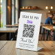 Einfaches modernes Tischschild für Ihr Unternehmen mit einem Zelle QR Code für Kunden, um nach Zahlungen zu suchen. Fügen Sie Ihren QR-Code, Firmennamen, Telefonnummer und Straßenadresse in einfacher Typografie hinzu.