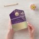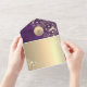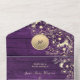 Romantische lila rustikale Holz-Einladungskarte zur Hochzeit mit elegantem goldenen Blumendesign, leuchtenden Lichterketten und personalisiertem Monogramm. Diese moderne und dennoch rustikale Einladung faltet sich in ihren eigenen Umschlag und enthält einen integrierten QR-Code für die RSVP und Ihre Hochzeitswebsite. Der tief lila Holzuntergrund und die goldenen Blumendetails erzeugen eine luxuriöse, stimmungsvolle Atmosphäre – perfekt für Herbst-, Scheunen- oder Abendhochzeiten. Ideal für Paare, die eine Mischung aus rustikalem Charme und anspruchsvoller Eleganz wünschen.
