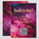 Die doppelseitige, flache Menükarte mit QR-Code aus der Kollektion "Celestial Elegance: The Marble Symphony", eine raffinierte und funktionelle Ergänzung zu Ihrem Hochzeitsempfang. Vor der atemberaubenden Marmor-inspirierten Kulisse mit elegantem, in Weiß und Weiß gedecktem Weinkeller lädt die Caption "Ready to dine?" zum Verweilen ein. Unter der Beschriftung befindet sich Platz für anpassbaren Text, wo Sie eine Nachricht oder Details über das Essen hinzufügen können. Das Design wird durch eine Touch von himmlischem Charme ergänzt, wobei die raffinierte Ästhetik der Sammlung erhalten bleibt. Die elegante Präsentation dreht auf der Rückseite der Karte und setzt sich mit einem lila, dunklen Hintergrund fort, der mit demselben Marmorbild geschmückt ist und ein durchgängiges und raffiniertes Aussehen schafft. Hier werden die Paarnamen, das Hochzeitsdatum und der Veranstaltungsort elegant angezeigt, was der Speisekarte eine personalisierte Touch verleiht. Auf dieser Seite finden Sie auch einen QR-Code, der den Gästen den Zugang zum digitalen Menü und weitere Informationen zum kulinarischen Angebot des Abends erleichtert. Diese doppelseitige, flache Menükarte dient nicht nur als praktische Anleitung für Ihren Hochzeitsempfang, sondern verbessert auch die Ästhetik mit ihren schönen Designelementen. Es ist Teil der umfangreichen Kollektion "Celestial Elegance: The Marble Symphony", die koordinierte Schreibwarenoptionen anbietet, um das Ambiente Ihres besonderen Tages zu erhöhen.