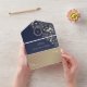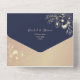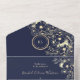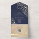 Elegant navy blue and rose gold all-in-one wedding invitation with floral design and monogram. This modern invitation doubles as an envelope and includes a QR code for RSVP and a wedding website link. The rich navy background paired with shimmering rose gold accents creates a timeless and romantic look — ideal for fall or winter weddings. A perfect mix of luxury and practicality for couples who love modern sophistication.