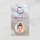 Diese elegante Luxus-Visitenkarte verfügt über ein irisierendes Perlmutter-Design und eine elegante handgeschriebene Schrift. Auf der Vorderseite befinden sich ein individuelles Logo und ein Foto. Auf der Rückseite befindet sich ein scannbarer QR-Code und eine individuelle Vorlage für Name, Adresse und Social-Media-Links. Diese professionelle glamouröse Visitenkarte ist perfekt für Salons, Make-up-Artists, Schmuck und mehr.