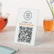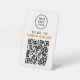 Modernes, individualisierbares Tischschild für Ihr Restaurant oder Café mit Ihrem Logo und QR-Code für Kunden, um nach Ihrem kontaktlosen Menü zu suchen und online zu bestellen. "Scan To Order Online" ist in fett schwarz und orange Typografie (kontaktieren Sie uns, wenn Sie die Farben ändern möchten). Fügen Sie zusätzliche Textzeilen hinzu, z. B. Ihre Website.