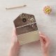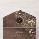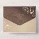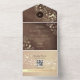 Charming rustic wood and rose gold all-in-one wedding invitation featuring elegant floral artwork, soft string lights, and a modern QR code for RSVP. The warm wood background paired with shimmering rose gold details creates a romantic and cozy feel, perfect for fall or barn weddings. This eco-friendly design folds into its own envelope and includes a personalized monogram on the top flap. Ideal for couples who love rustic charm with a touch of luxury.