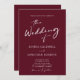 Alles in einem QR-Code UAWG Chic Moderne White Calligraphy Script Burgundy Hochzeit Einladung... Unsere trendige, minimalistisch-bordeauxfarbene und weiße Hochzeitseinladung bietet moderne Kalligraphie-Skripte kombiniert mit Serif- und Sans-Serif-Text für eine einfache und schicke Hochzeitseinladung. Auf der Rückseite der Einladung wird auch der QR-Code Ihrer Hochzeitswebsite sowie die URL der Website selbst angezeigt, die es Ihren Einladenden ermöglicht, einfach online zu UAWG und alle Details, die normalerweise in einem Hochzeitspaket gesendet werden, einzusehen. Das Beispiel QR-Code-Grafikvorlage und alle Beispieltexte (außer den grafischen Kalligrafieelementen) können mit eigenen Informationen über die Personalisierungsvorlage leicht überarbeitet werden.