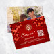 Rote Kirsche blüht auf einem glänzenden rubinroten Hintergrund mit einem goldenen doppelten Glückssymbol chinesischen Hochzeitskarte RSVP. Scannen Sie mir qr Code-Karte für Details auf Ihrer Hochzeitswebsite und uAwg online. Fügen Sie Ihr Foto auf der Rückseite ein.