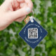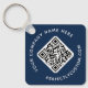 Doppelseitiger Schlüsselanhänger mit QR-Code und benutzerdefinierter Text auf dunkelblauem oder benutzerdefiniertem Farbhintergrund. Ändern Sie die Schriftart- und Schriftart-Farben, verschieben und verändern Sie Elemente mit dem Entwurfstool.