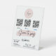 Business Scan zu bezahlen QR-Code Podestal Zeichen. Alles kann leicht mit Ihrem Firmenlogo, QR Codes, individuellem Text, Zahlungsbildern und Social Media Icons aktualisiert werden.