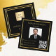 Ein klassischer schwarzer Hintergrund und Imitate goldene Rahmen. Personalisieren Sie Ihr Firmenlogo, Ihren Firmennamen und Ihren Text auf der Vorderseite. Zurück: Vorlagen für Ihren Namen, Titel, Foto, Telefonnummer, E-Mail- und Website-Adresse, QR-Code für Ihre Website oder Ihr Social-Media-Konto.