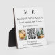 Modernes Minimalistisches Business Plaque Tabletop Schild mit 2 Fotos. Schwarz & Weiß oder wählen Sie Ihre eigenen Farben. Fügen Sie dem QR Scan Code Ihre Website oder Web-Adresse für Social Media hinzu. Ermöglicht den Kunden, die Prüfung zu verwenden, um auf Informationen zu Ihren Produkten wie Produkten oder Menüelementen zuzugreifen. Ideal für Einzelhändler, kleine Geschäfte, kleine Kioske, Messen und Events, Gastfreundschaft, Salons, Wellness-Center, Bäckereien, Cafés, Restaurants, Bars und vieles mehr. Einfach mit Ihren Monogramm-Initialen, Firmennamen und Informationen, Fotos, Slogan oder sogar mit Ihrem Logo oder persönlichem Markendesign personalisieren.