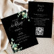 Schwarz-Weiß-Grün Floral QR Code Einladung Hochzeitsfeiern Diese einfache und elegante Einladung zum Hochzeitsfeiern mit schöner Wasserfarbe Eukalyptusblattäste & wurde gepaart mit einer whimsikalen Kalligraphie und einem klassischen Serif-Schriftart in Gold und Grau. Um erweiterte Änderungen vorzunehmen, wählen Sie bitte die Option "Klicken Sie, um weitere Anpassungen vorzunehmen" unter Diese Vorlage personalisieren aus.
