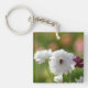 Doppelseitiger Schlüsselanhänger mit einem Bild auf der Seite der Felder der Blume und einem Bild eines weißen Rändels auf der anderen Seite.