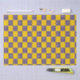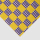 Ein Muster abwechselnder gelber und blauer Quadrate erzeugt einen Schachbretteffekt. Die blauen Quadrate sind mit weißen Kreisen gepunktet, was dem hellgelben Kontrast einen spielerischen Kontrast verleiht.
