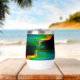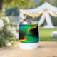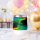 Ein blaues, grünes und orangefarbenes Fraktal mit Sternen im Hintergrund, eine Darstellung des Physikphänomens, die Quantenverwicklung genannt wird. Passen Sie Ihren eigenen Text an.