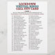 Genießen Sie einen Spot Bingo mit diesem coolen und lustigen Quarantäne-Sperrspiel, das Sie online oder persönlich spielen können, wenn Sie alle in der gleichen Blase oder Haushalt leben. Ideal für Babydusche, Brautparty, Party. Die Möglichkeiten sind endlos Karo aus den 5 Bingokarten in dieser Sammlung und der Call-Out-Karte, um Ihr Set zu vervollständigen. Die Aktivitäten wurden so organisiert, dass keine zwei Karten dieselbe Kartennummer haben: Bingo Call Out List