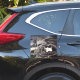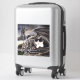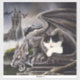 Das schwarz-weiße Tuxedo Kitten sitzt neben einem Gargoyle. Hinter ihnen steht ein Schloss und Drachen.