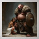A fierce, armored warrior stands next to a kneeling enchantress in an ancient setting. The warrior wears a fur cloak and holds a large shield, while the enchantress dons a delicate crown.