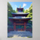 Eine ruhige digitale Kunstdarstellung eines winzigen japanischen Tempels, versteckt vor einem dichten, grünen Wald. Der Tempel strahlt ein ruhiges, friedliches Ambiente aus, das die Gäste zum Anhalten, Atmen und Nachdenken einlädt. Es ist ein ideales Beispiel für die stille Schönheit der japanischen Schreine, die durch das üppige Grün der umgebenden Landschaft hervorgerufen wird, was zum Gefühl der natürlichen Schönheit und Ruhe der Szene beiträgt.