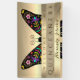 Extravaganter, eleganter, bezaubernder schwarzer Schmetterling mit mexikanischen farbenfrohen Blumendekoren in Kombination mit stilvollem Glam, luxuriösem, glitzerndem goldfarbenem Hintergrund. Einzigartiges, trendiges, whimsical Quinceanera Geburtstagsbanner.