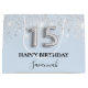 Elegant, klassisch, glamourös und mädchenhaft für eine Quinceañera, 15. Geburtstagsfeier. Ein trendiger, blauer, blauer Hintergrund. Dekoriert mit Imitaten silberner Glitzer Staub. Personalisieren und einen Namen hinzufügen. Mit dem Text: Happy Birthday. Der Name ist mit einem modernen handgeschriebenen Stilskript geschrieben. Nummer 15 wird mit einem Schriftart im Ballonstil geschrieben.