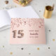 Ein Gästebuch für eine mädchenhafte und glamouröse Quinceañera, 15. Geburtstagsfeier. Ein Imitat Rose goldener Hintergrund mit Rose Gold, rosa tropfende Sterne. Personalisieren und fügen Sie einen Namen und ein Datum hinzu. Der Name ist in dunklem Rose Gold mit einem modernen handgeschriebenen Stil geschrieben. Nummer 15 wird mit einem Schriftart im Ballonstil geschrieben.