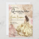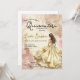 Elegant invitation for a debutante party in shades of Rose with touches of gold. Romantic floral design with an illustration of a dress.