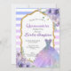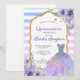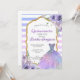 Elegant invitation for a debutante party in shades of purple with touches of glitter. Striped summer design with an illustration of a dress.