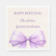 A soft ivory background color. Decorated with a large lavender colored bow. Personalize and add the name and date. Text: Happy Birthday!
