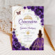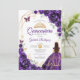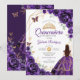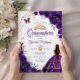 Lila, goldene und weiße Quinceanera-Feier Einladung. Features, brünettes Mädchen in Ballkleid, Skript-Schriftart, Goldschmetterlinge, Aquarell-Rose und Tiara. Ideal für eine elegante Glasfeier im Prinzessinnstil. Personalisieren Sie Ihre persönlichen Daten. Gedruckte Zazzle-Einladungen oder Sofortdownload digitaler Druckvorlage.