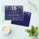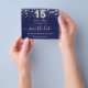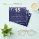 Bitte beachten Sie, dass dies Save the Date auf Flyer Papier und sehr dünn ist. Umschläge sind nicht enthalten. Für eine dickere Save the Date Karte (das gleiche Design) besuchen Sie bitte unseren Shop. Eine junge und trendige Save the Date für eine Quinceañera, 15. Geburtstagsfeier. Ein marineblau gefärbter Hintergrund. Dekoriert mit Imitaten silberne Sterne. Der Text: Save the Date ist mit einem großen angesagten, handgeschriebenen Stilskript geschrieben. Nummer 15 wird mit einem Schriftart im Ballonstil geschrieben.