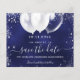 Bitte beachten Sie, dass dies Save the Date auf Flyer Papier und sehr dünn ist. Umschläge sind nicht enthalten. Für eine dickere Save the Date Karte (das gleiche Design) besuchen Sie bitte unseren Shop. Eine junge und trendige Save the Date für eine Quinceañera, 15. Geburtstagsfeier. Ein marineblau unebenfarbiger Hintergrund. Dekoriert mit Imitaten silberner Glitzer und weiße Ballons. Der Text: Save the Date ist mit einem großen angesagten, handgeschriebenen Stilskript geschrieben.