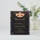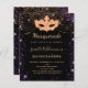 Für eine elegante Quinceañera, 15. Masquerade themed Geburtstagsparty. Ein stilvoller schwarzer Hintergrund. Dekoriert mit lila Imitaten Goldstaub und eine goldene Maskerade. Personalisieren und fügen Sie Namen, Alter und Party Details hinzu. Der Name wird mit einem handgeschriebenen Stilskript geschrieben