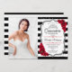 Quinceanera Party Einladung mit Ihrem Foto. Enthält Schwarz-weiße Streifen, Skript-Schriftart, rote Rosen, Tiara und Konfetti. Klassisches Schwarz-weißes rotes Design mit Imitaten Glitzer Silber. Ideal für eine elegante Feier.