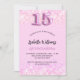 Eine moderne, stilvolle und glamouröse Einladung für eine Girl's Quinceañera, 15. Geburtstagsfeier. Ein rot rosa Hintergrund mit Konfetti. Der Name ist mit einem modernen handgeschriebenen Stilskript geschrieben. Personalisieren Sie Ihre Party-Daten und fügen Sie sie hinzu. Nummer 15 wird mit einem Schriftart im Ballonstil geschrieben, Skript.
