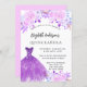 Eine moderne, stilvolle und glamouröse Einladung zu einer Quinceañera, 15. Geburtstagsfeier. Weiße Hintergrundfarbe mit rot-rosa Blume, ein lila Kugelgewand. Der Name ist mit einem modernen handgeschriebenen Stilskript geschrieben. Personalisieren Sie Ihre Party-Daten und fügen Sie sie hinzu.