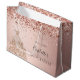 Eine Geschenktasche für eine gmädchenhafte und glamouröse Quinceañera, 15. Geburtstag. Eine Rose mit goldenem Hintergrund mit Konfetti. Personalisieren und fügen Sie Datum und Namen hinzu. Der Name ist mit einem modernen handgeschriebenen Stilskript geschrieben