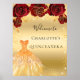 Ein Begrüßungspposter für eine Quinceañera, 15. Geburtstagsfeier. Ein Imitat goldener Hintergrund mit Imitaten goldenen Glitzer Staub, ein Kleid und rote Rosen, Blumensträuße. Personalisieren und einen Namen hinzufügen.