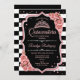 Rose Gold Schwarz-weiß Quinceanera feiern Einladung. Enthält Streifen, Skript-Schriftart, rosa Rosen, Tiara und Konfetti. Klassisches Design mit Imitate Glitzer Rose Gold. Ideal für eine elegante Glamour.