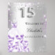 Elegant und glamourös und mädchenhaft für eine Quinceañera, 15. Geburtstagsfeier. Ein Imitat silber metallisch aussehender Hintergrund mit lila und Imitaten silbernen Glitzer Staub. Personalisieren und einen Namen hinzufügen. Nummer 15 wird mit einem Schriftart im Ballonstil geschrieben. Zurück: kein Design