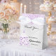 Elegant, klassisch, glamourös und mädchenhaft für eine Quinceañera, 15. Geburtstagsparty-Favoriten. Ein Imitat silber metallisch aussehender Hintergrund mit lila Imitaten Glitzer Staub und ein Kleid. Mit dem Text: Quinceañera und Vielen Dank, geschrieben mit einem modernen Schrift im Stil der Schrift. Personalisieren und fügen Sie einen Namen und ein Datum hinzu.
