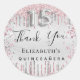 Modern, stilvoll und glamourös für die Quinceañera eines Mädchens, 15. Geburtstagsfeier. Ein Imitat silber aussehender Hintergrund, dekoriert mit rosa und Imitaten silberne Glitzer Staub. Mit dem Text: Danke. Personalisieren und einen Namen. Nummer 15 wird mit einem Schriftart im Ballonstil geschrieben, Skript.