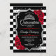 Silver Schwarz-weiß Quinceanera feiern Einladung. Enthält Streifen, Skript-Schriftart, rote Rosen, Tiara und Konfetti. Klassisches Design mit Imitaten Glitzer Silber. Ideal für eine elegante Glamour.