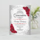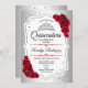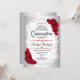 Silver Weiß Quinceanera Feier Einladung. Enthält Skript-Schriftart, rote Rosen, Tiara und Konfetti. Klassisches Design mit Imitaten Glitzer Silber. Ideal für eine elegante Glasfeier im Prinzessinnstil. Personalisieren Sie Ihre persönlichen Daten. Gedruckte Zazzle-Einladungen oder Sofortdownload digitaler Druckvorlage.