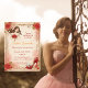 Celebrate your princess with this elegant, romantic Quinceañera Birthday Invitation featuring a watercolor princess in a stunning red rose gown, gold crown, floral accents, and a vintage parchment background.