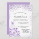 Eine moderne, stilvolle und glamouröse Einladung zu einer Quinceañera, 15. Geburtstagsfeier. Auf der Vorderseite ein weißer Hintergrund mit violettem, lila Glitzern, ein violettes Kleid. Der Name ist mit einem modernen handgeschriebenen Stilskript geschrieben. Personalisieren Sie Ihre Party-Daten und fügen Sie sie hinzu.