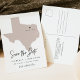 Dieses Reisemotiv Save the Date Postcard beinhaltet eine schwarze Texas-Karte und eine Postkartenablage. Verändern Sie die Farben einfach und bewegen Sie das Herz, um Ihr Ziel zu markieren. Bearbeiten Sie den *most*-Text, um Ihren Bedürfnissen gerecht zu werden, und fügen Sie dem Hintergrund der Einladung einfach eine spezielle Nachricht hinzu.