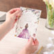 Dieses wunderschön gestaltete Quencentera Birthday Party Invitation besticht durch ein glamouröses lila Kleid mit einem goldenen Bogen, der mit Blume und Schmetterlingen geschmückt ist.