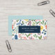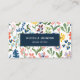 Charmante Visitenkarte für einen Zuhause-Stylist, Innenarchitektin, Kosmetikerin oder mehr mit einem handgezeichneten Muster von verrückten Blume, Kräuter, Grünpflanzen und Beeren in Blau, Korallen, Rosa und Gelb.