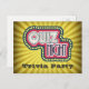 Ein Quiz der Nachts-Trivia-Party Einladung nach der Postkarte. Mit großer mutiger Typografie umgeben von Wandleuchten. Der Hintergrund ist ein gelbes Sonnenbrust-Muster.