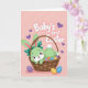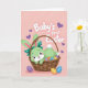 This greeting card features a friendly green rabbit 🐰 peeking out of a woven brown basket, with round shiny eyes and a soft, affectionate gaze that feels like it’s meant for someone close. A teal bow sits at its neck, and its long ears are green with pink inner details, adding a gentle, springlike look. A small white tail shows just above the basket rim, giving the scene a cozy, close-up feel. The basket is filled with decorated egg-shaped treats in lavender, blue, yellow, and orange, some tucked inside and some scattered nearby as if shared between friends. The background is blush pink with faint diagonal texture, keeping attention on the rabbit and the basket. Several purple heart shapes float around the rabbit, hinting at romance or friendship 🌷 without needing extra words. Near the top, bold white lettering in a rounded font is centered and easy to read against the pink backdrop. The eggs show stripes and swirls in alternating colors, and the basket weave is shaded with darker lines along the edges.