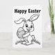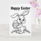 This card features a black-and-white line drawing of an upright cartoon rabbit centered near the lower middle, smiling with bright eyes and slightly tilted head, as if sharing a sweet, friendly moment with whoever opens it 🐰. Its long ears stand up with light shading inside, and the rounded cheeks and open grin give it an affectionate, welcoming look. The rabbit holds a decorated oval egg close to its body like a small gift, with wavy and straight bands wrapping around it in neat patterns. Simple tufts of grass sit under its feet, suggesting a springtime lawn without adding extra background clutter. Across the top, a large greeting appears in thick, easy-to-read uppercase letters, set in black against the white space. The open area around the character keeps the focus on the rabbit and the egg, and the minimal linework feels like a coloring-page style design 🌷. Fine contour lines define the rabbit’s paws, belly, and tail, while the egg’s stripes alternate between curved and straight sections. The composition stays monochrome, with the rabbit’s perked ears, grassy strokes, and patterned oval egg clearly outlined beneath the top text.